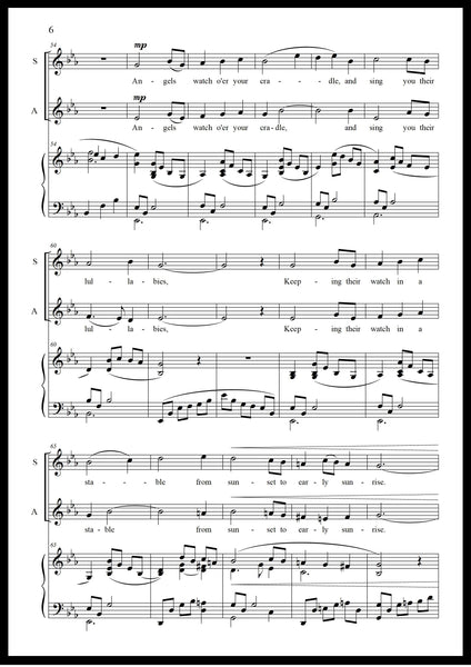 Written during his first term as composer-in-residence for the Woodstock Fanshawe Singers, "Peace 'Til the Dawn" is a part of the set Saving Grace (SATB). With its music box accompaniment, this charming lullaby is also quite capable of standing alone.